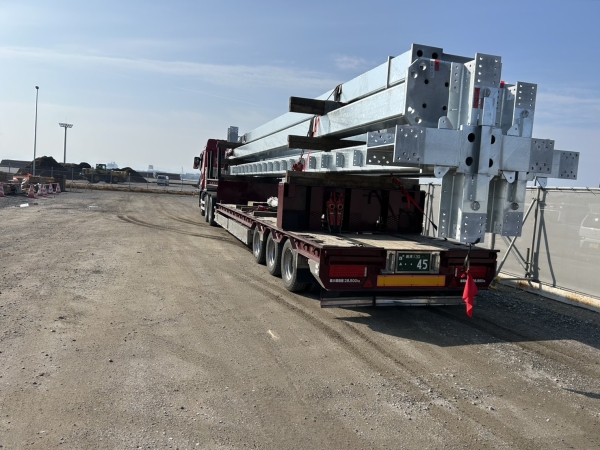 長尺かつ形状が特殊な鉄骨は、通常のトレーラーでは高さ制限や積載バランスの問題が出やすい貨物です。