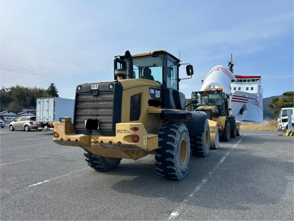 隠岐に到着後は、フェリーからそのままホイールローダーを降ろし、自走にてお客様のもとへ納車。